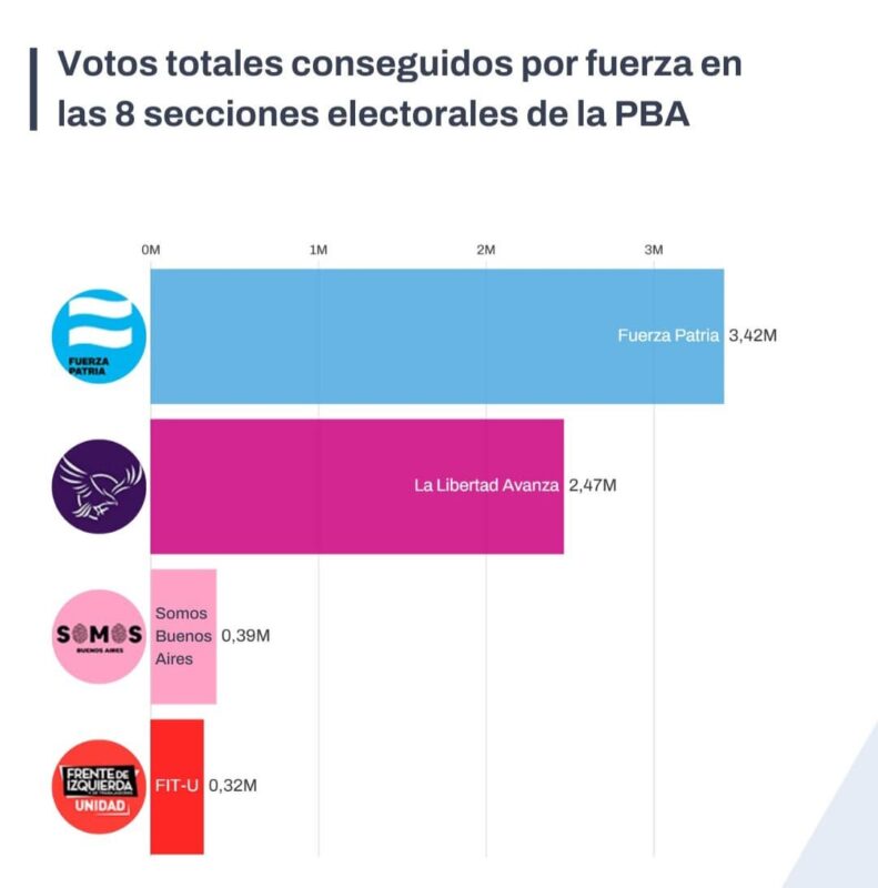 - La Séptima Sección, donde solo eligieron tres senadores, las fuerzas necesitan alcanzar al menos el 33,33%. Fuerza Patria sacó 38,2% y se quedó con las tres bancas porque los libertarios solo sacaron 32,8%. Muy atrás quedó Somos Buenos Aires, que con apenas el 15,18% se quedó sin representación en la Legislatura.