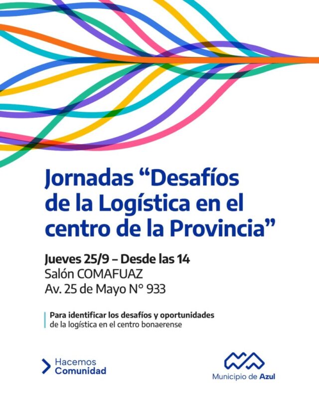 El Municipio de Azul invita a la comunidad a participar de las jornadas “Desafíos de la logística en el centro de la Provincia de Buenos Aires”, que se realizarán el jueves 25 en el Salón COMAFUAZ (Av. 25 de Mayo 933). La propuesta, impulsada por la Subsecretaría de Producción, Comercio e Innovación de la comuna, está dirigida a municipios de la región, organismos gubernamentales, cámaras empresariales, empresas de logística y sectoriales, parques industriales, colegios de profesionales, universidades, centros de investigación e instituciones comunitarias.